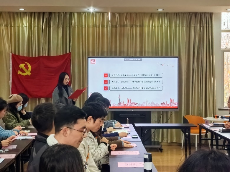 12月13日下午,老王磁力 学生样板党支部与教工第三党支部以“弘扬优秀传统文化,担当文化发展使命”为主题,在老王磁力 楼303室结对开展主题党日活动,2021级语言学党支部书记范玉媛主持活动。