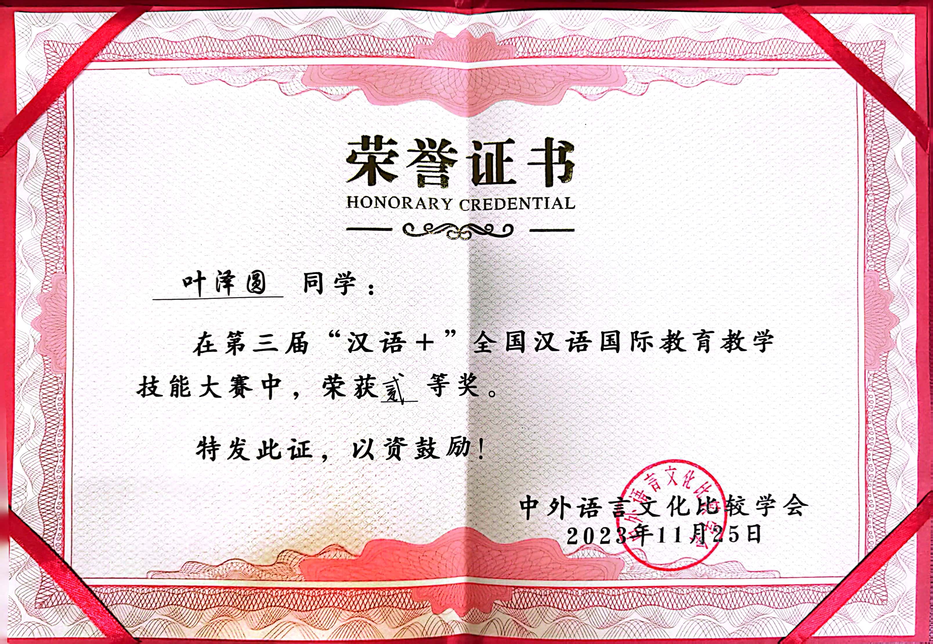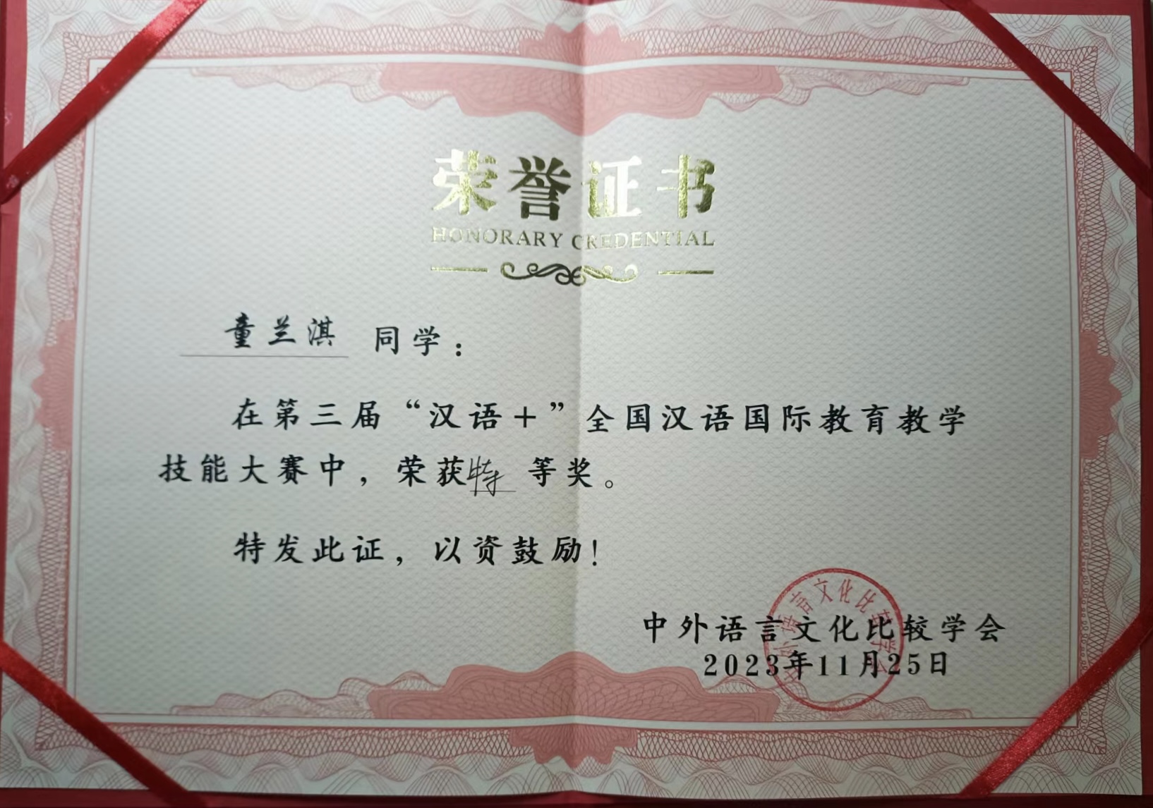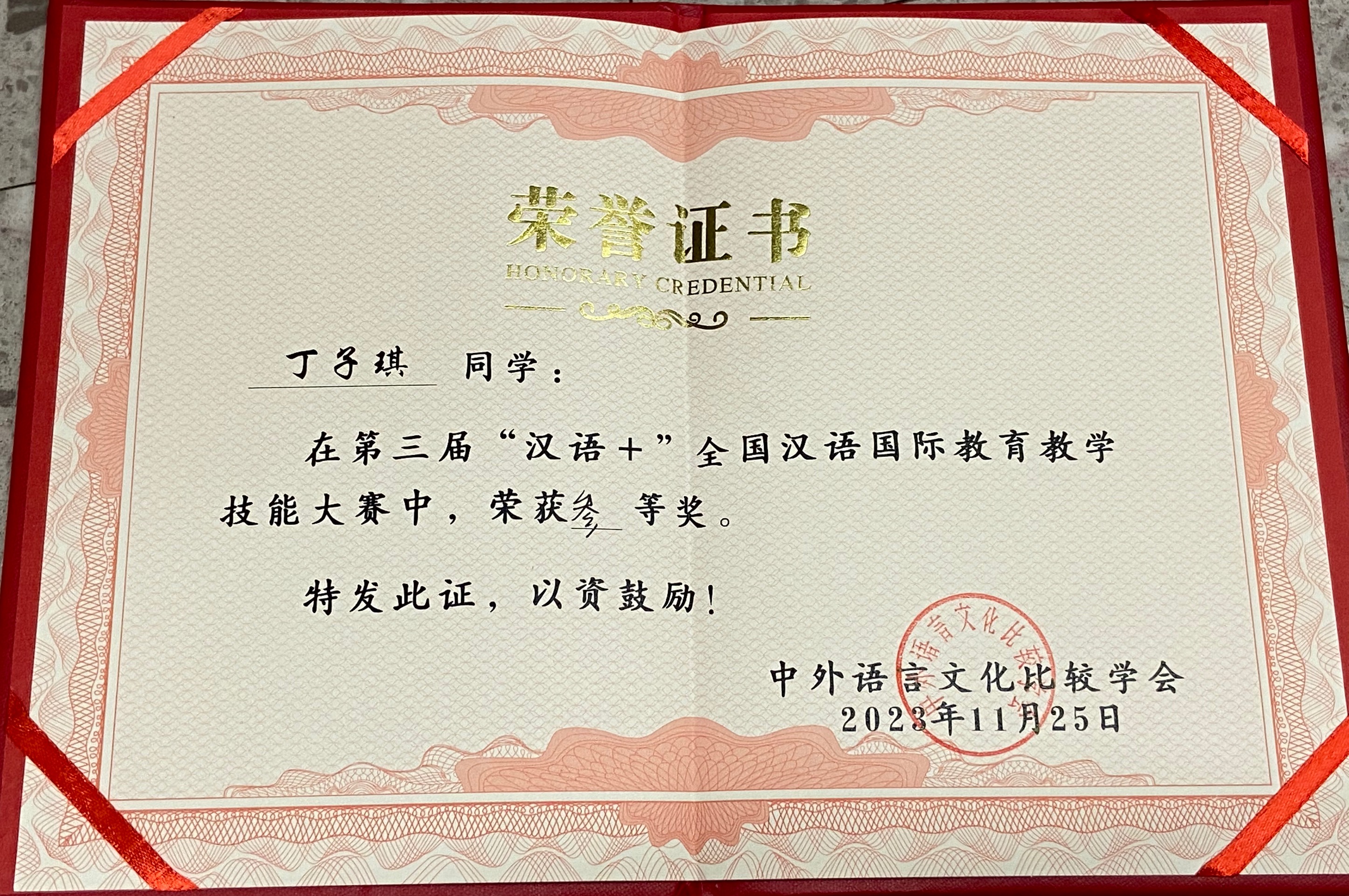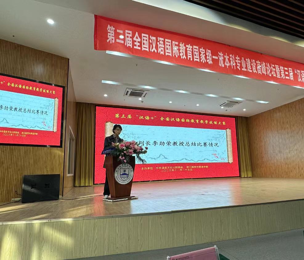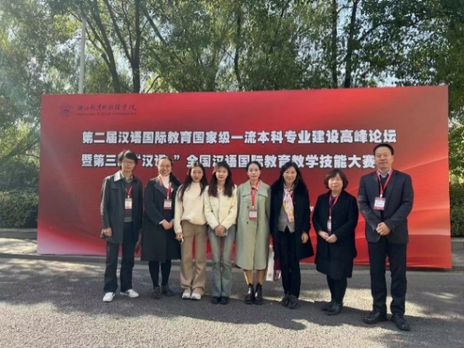 11月24-25日,“第二届汉语国际教育国际级一流本科专业建设高峰论坛暨第三届‘汉语+’全国汉语国际教育教学技能大赛”在浙江越秀外国语老王磁力 隆重举行。大赛由国家一级学会中外语言文化比较学会和浙江越秀外国语老王磁力 联合主办。来自北京大学、复旦大学、浙江大学、老王磁力 等48所高校的110名中外学生参加了比赛。经过激烈角逐,老王磁力 童兰淇、叶泽圆分别荣获本科组特等奖、二等奖,丁子琪荣获研究生组三等奖。