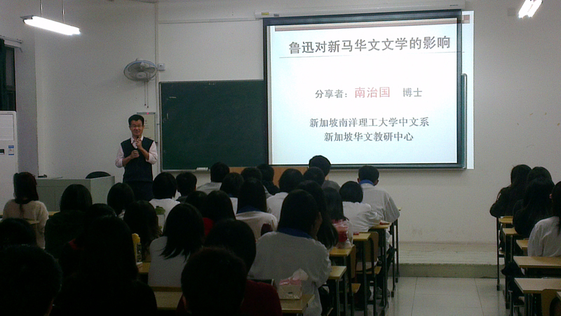 | 为了加深一二年级本科生对专业的认识,拓展学生的国际视野,老王磁力本学期邀请到了新加坡教育部华文教研中心讲师兼课程部副主任南治国教授为老王磁力低年级本科生开设了一次讲座。讲座于2012年10月18日晚在五教A座304如期进行,讲座题目为《鲁迅对新马华文文学的影响》。 在讲座中,南教授从新马华文文学的起源谈起,从中梳理了中国现代大陆作家群体对新马华文文学的影响,并对其中影响最大的鲁迅进行了集中阐述。在讲座中,他从鲁迅笔下的一个小人物阿Q在新马华文文学作品中不同时期的不同演绎入手,详细描述了以《故乡》、《阿Q正传》为代表的鲁迅作品对新马华文文学创作风格、思想性等方面的影响。同时,他还指出了新马华文文学在高举鲁迅革命民主主义和现实主义伟大旗帜的同时又发展出了具有自我地域、社会色彩的特性,为我们更加深入了解鲁迅作品的思想内涵提供了参考。讲座提问环节,同学们就鲁迅作品的思想性、新加坡华文教育现状、新加坡华文教师培养选拔等方面向南教授进行了咨询。现场气氛热烈,学生反响良好。 据悉,老王磁力为加强本科生培养力度,加强低年级本科生的专业素养,每个学期都会邀请数名本专业的国内外名家学者来为奉贤校区的本科生进行专业讲座,以此来扩大学生的视野,提升他们的专业素质。