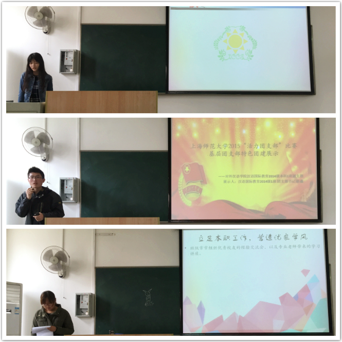 在奉贤校区5B-204举行“创新驱动、青春舞动”活力团支部大赛的初赛。 参加初赛的各团支部通过PPT展示以及团员风采展示精彩地介绍了各自的特色和精髓。2013级和2014级三个团支部各有所长,着实给裁判员出了难题。