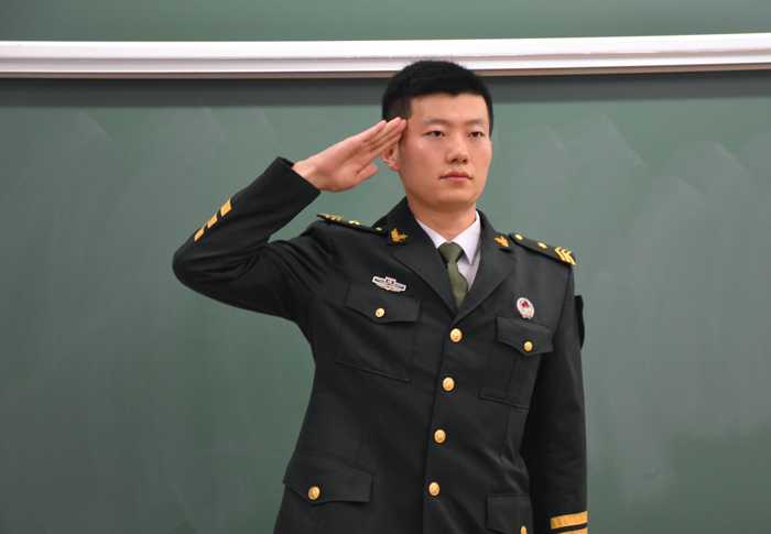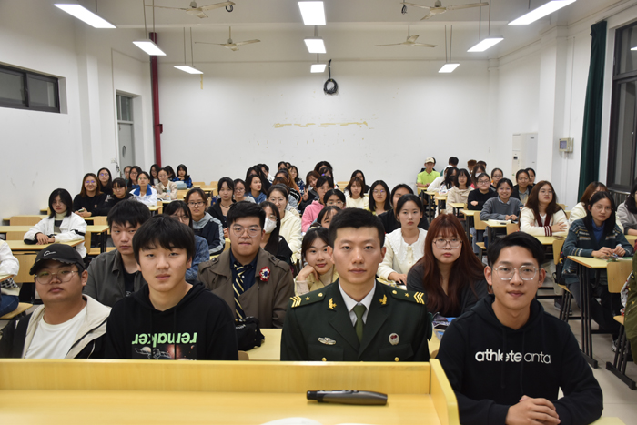 韩宽恒,2018年9月入伍,2018年9月至2020年9月以义务兵身份服役于武警上海市总队。在此次宣讲会中,韩宽恒向同学们介绍了大学生参军入伍的基本流程和参军的意义。首先,韩同学结合自身经历从入伍基本条件、报名参军基本流程、留队考学提干、保留学籍、学费补偿、优待政策这六个方面详细地为同学们介绍了大学生参军入伍的基本政策,使得同学们对参军入伍有了较为清晰的理解。随后,韩宽恒同学以饱满的热情向同学们讲述了参军的意义。他表示,参军入伍能让同学们学会立身做人、增强集体荣誉感、培养团队意识。在军营里,同学们能深刻体会到革命先烈的艰苦奋斗精神,从而树立责任感和奉献意识。最后,吕金桥老师鼓励同学们积极响应国家号召,投身军营,建功立业。