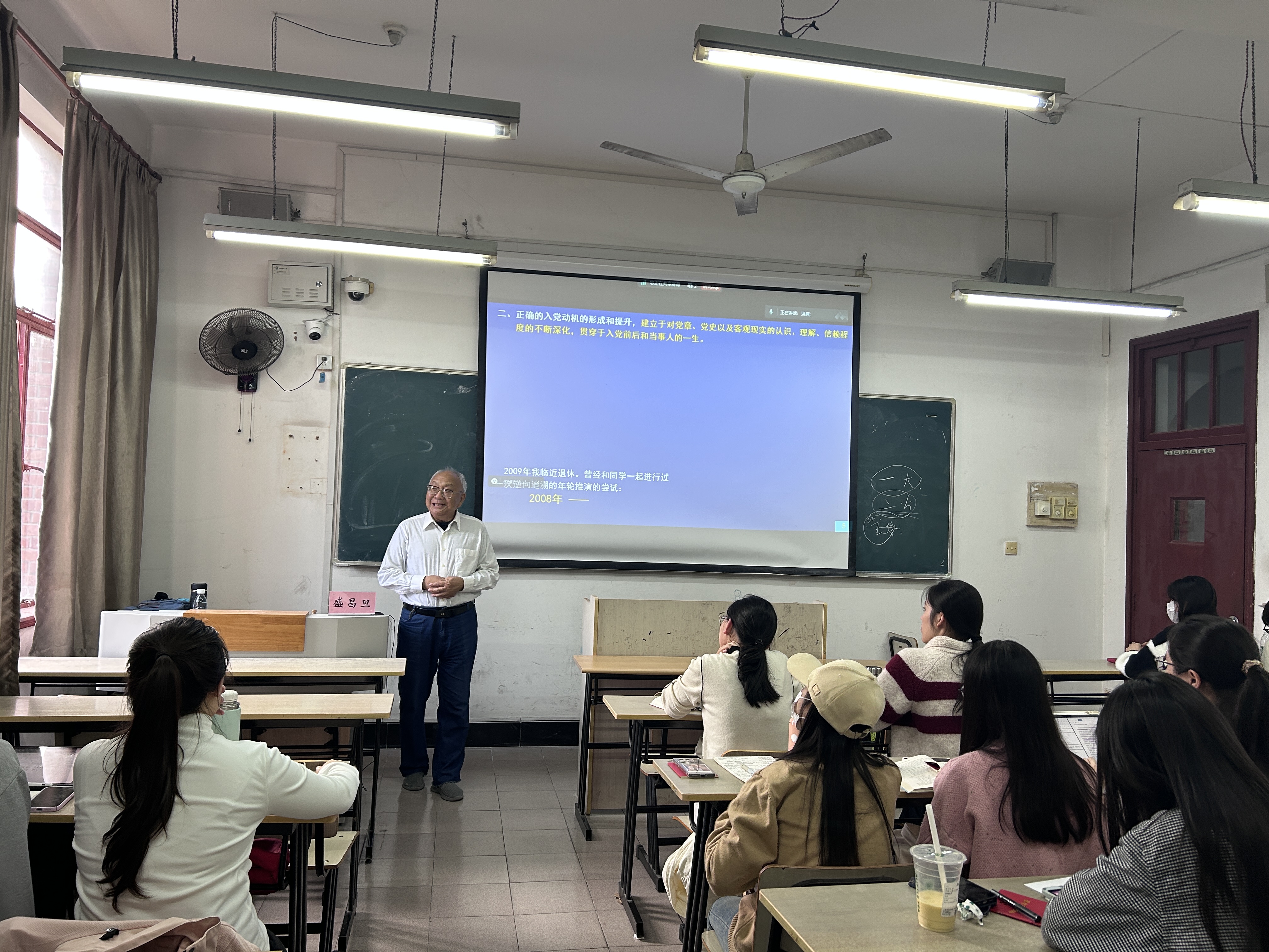 盛昌旦老师围绕“依靠组织完善自我 报效国家服务人民”,结合自己从二十岁递交入党申请书起的丰富经历,强调“《党章》的学习是全体党员的基本功,学习《党章》不应只为背诵,而是要审视自己的行为思想是否符合党章要求,锤炼自己的党性”。“历史是最好的老师”,盛老师在系统讲解党史、中国百年奋斗史、改革开放史和社会主义发展史中,指明新时代青年的责任与使命,并以新中国同龄人和党员前辈的身份,对学生提出要求:立志坚持用党员标准对照自己的思想言行,对党忠诚,严格自律;经得起世俗观念的侵袭和诱惑,经得起困难挫折的考验和磨砺。