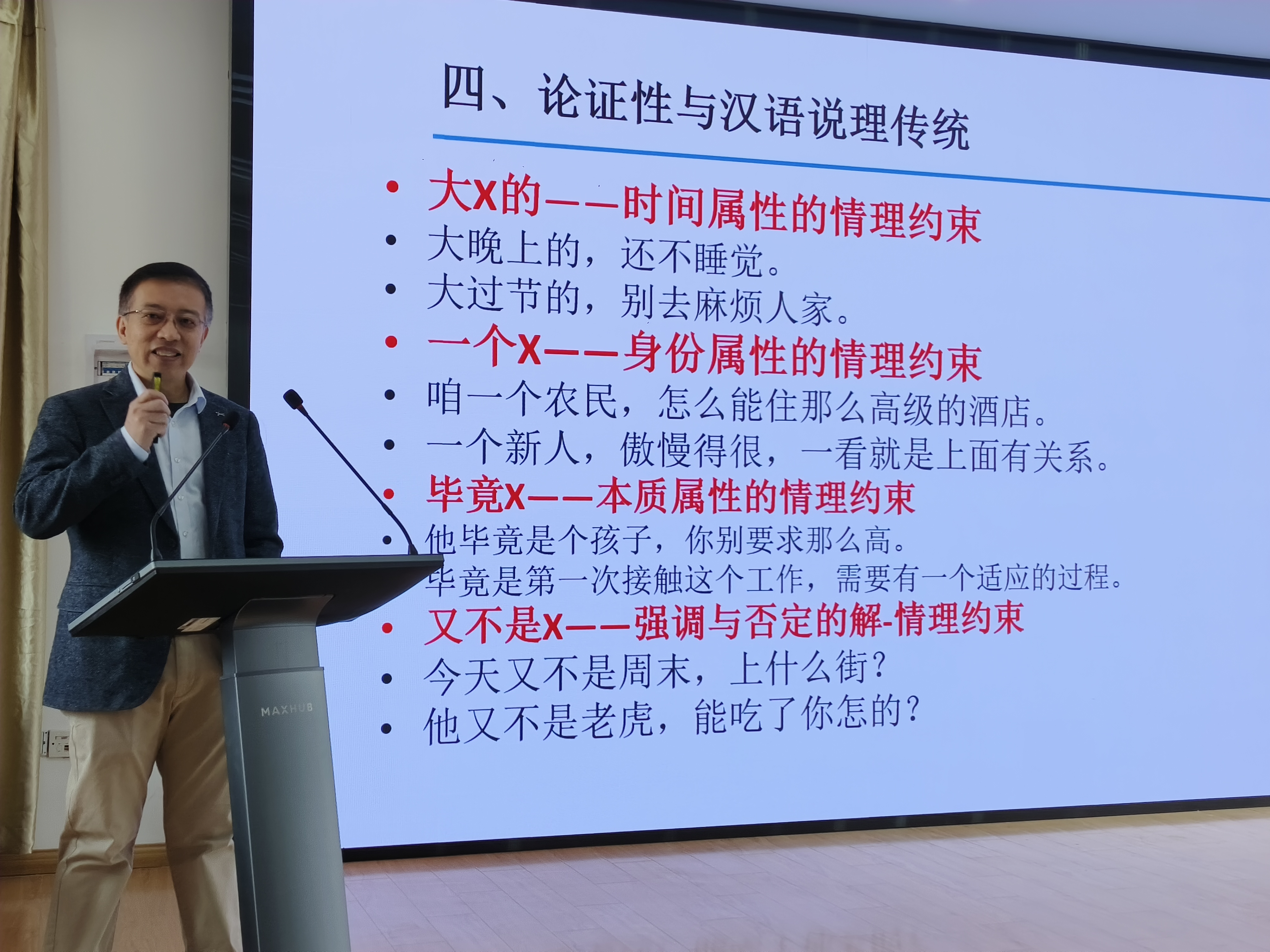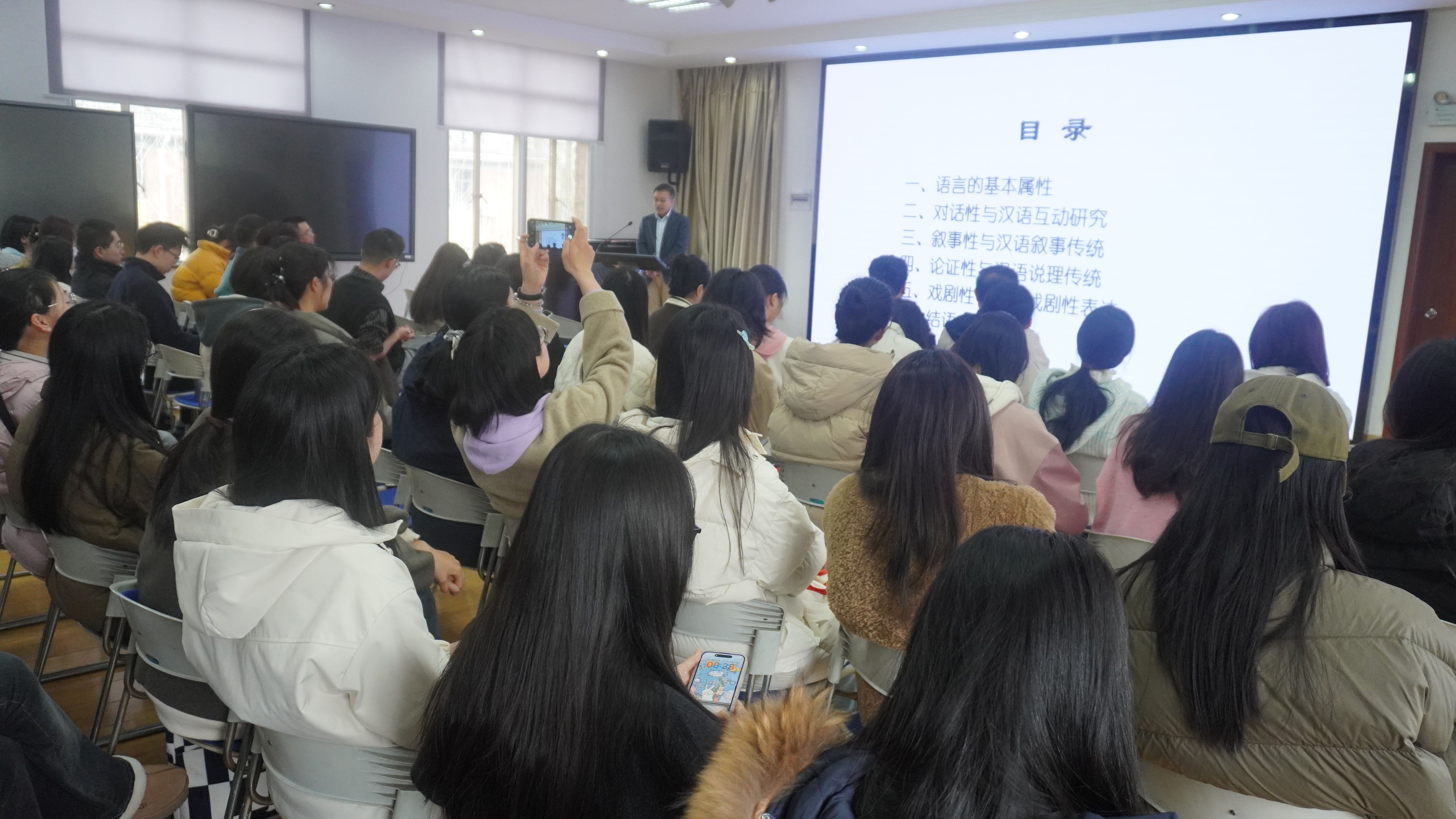 讲座中,史金生教授以语言交际属性的理论建构为切入点,系统阐释了汉语的对话性、叙事性、说理性和戏剧性等四大核心特征。史教授还创造性地运用京剧“打背躬”的表演程式,生动解构语言互动中的“出戏”“入戏”现象,并通过汉语“你”的移指用法等鲜活语例,揭示虚拟对话在立场建构中的重要作用。针对探索语法学创新之路,史金生教授强调,需要加强学科体系、学术体系、话语体系的建设,深入挖掘语法事实,加强语法理论总结。