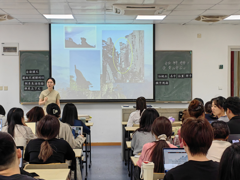 朱颖老师以人教版二年级课文《黄山奇石》为教学内容,引导学生深入文本,感受黄山奇石的独特魅力。随后,她借助课文插图,帮助学生理解“金鸡叫天都”“猴子观海”等抽象描述,通过可视化教学手段,培养学生“图文互转”的能力,帮助他们建立起“文字—图像—情感”的立体认知。最后,通过联系上下文,为学生提供“思维脚手架”,锻炼学生自主创作的能力,展现了高阶思维培养的策略。整个教学过程环环相扣,层层递进,充分展现了“读思联动”的教学理念,为学弟学妹们搭建起小学语文授课意识的四维框架。这种“以课为媒”的传薪方式,让未来教师不仅看到“如何教”,更懂得“为何教”,真正实现了从“教学技法”到“教育哲学”的跃升。