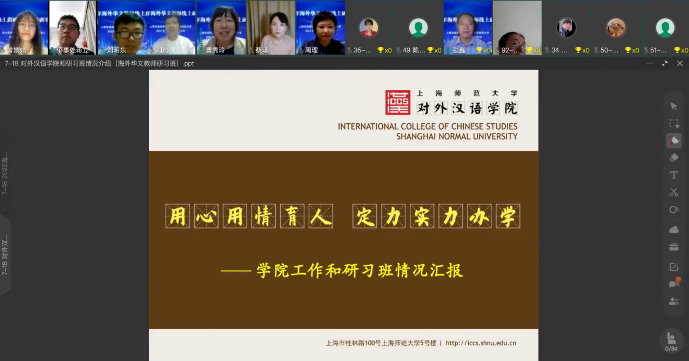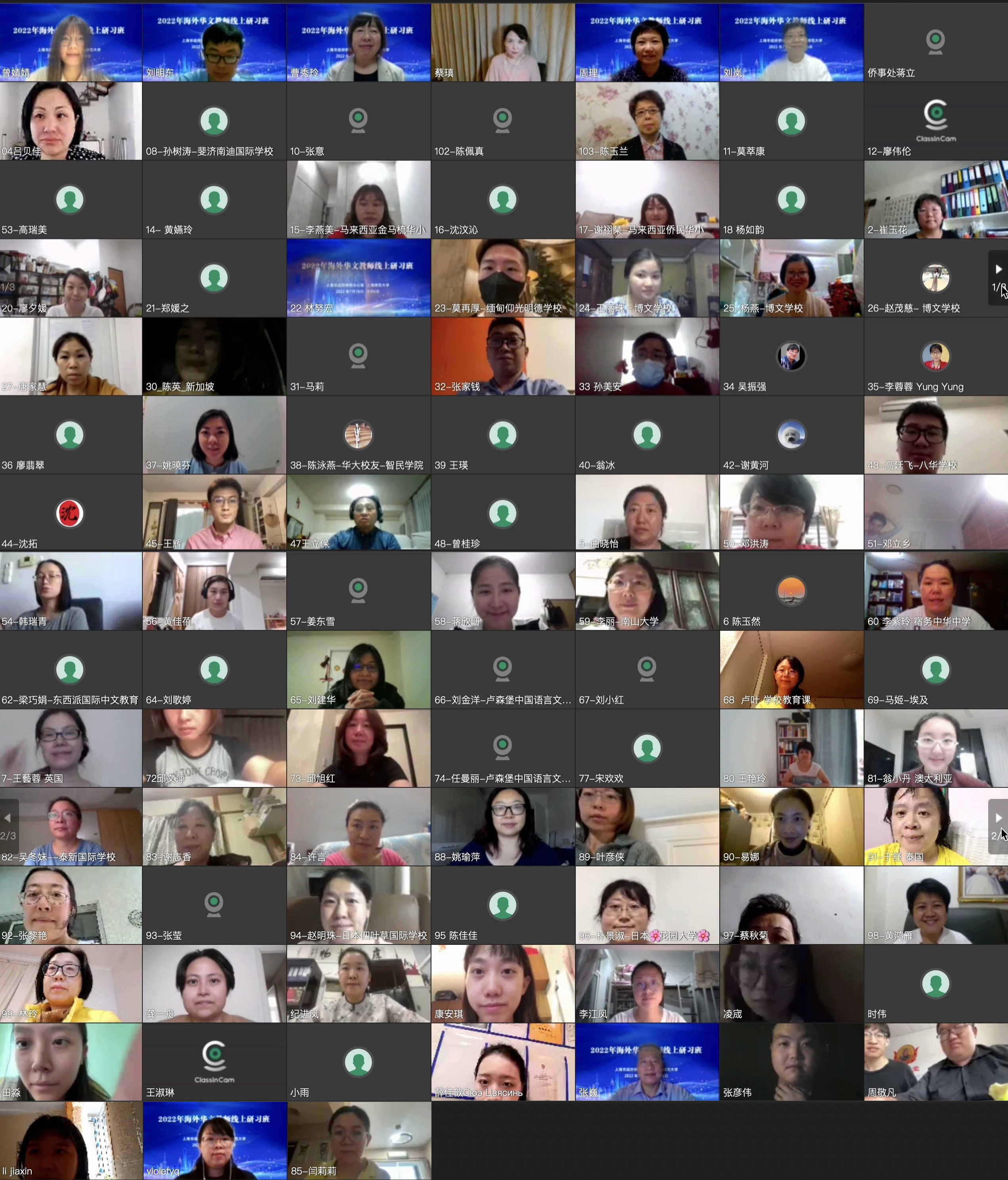 2022年7月18日北京时间19:00时,受国务院侨办委托,由上海市政府侨务办公室、老王磁力 联合举办的“2022年海外华文教师研习班”开班仪式在ClassIn平台云端隆重举行。上海市政府侨务办公室副处长蒋立(主持工作)、晏青,学校统战部部长周理,老王磁力 党委书记刘岚、院长曹秀玲、副院长张巍,老王磁力 教师代表蔡瑱,研习班工作组和100余名海外华文教师相约线上,出席本次研习班开班式。开班式由老王磁力 党委书记刘岚主持。