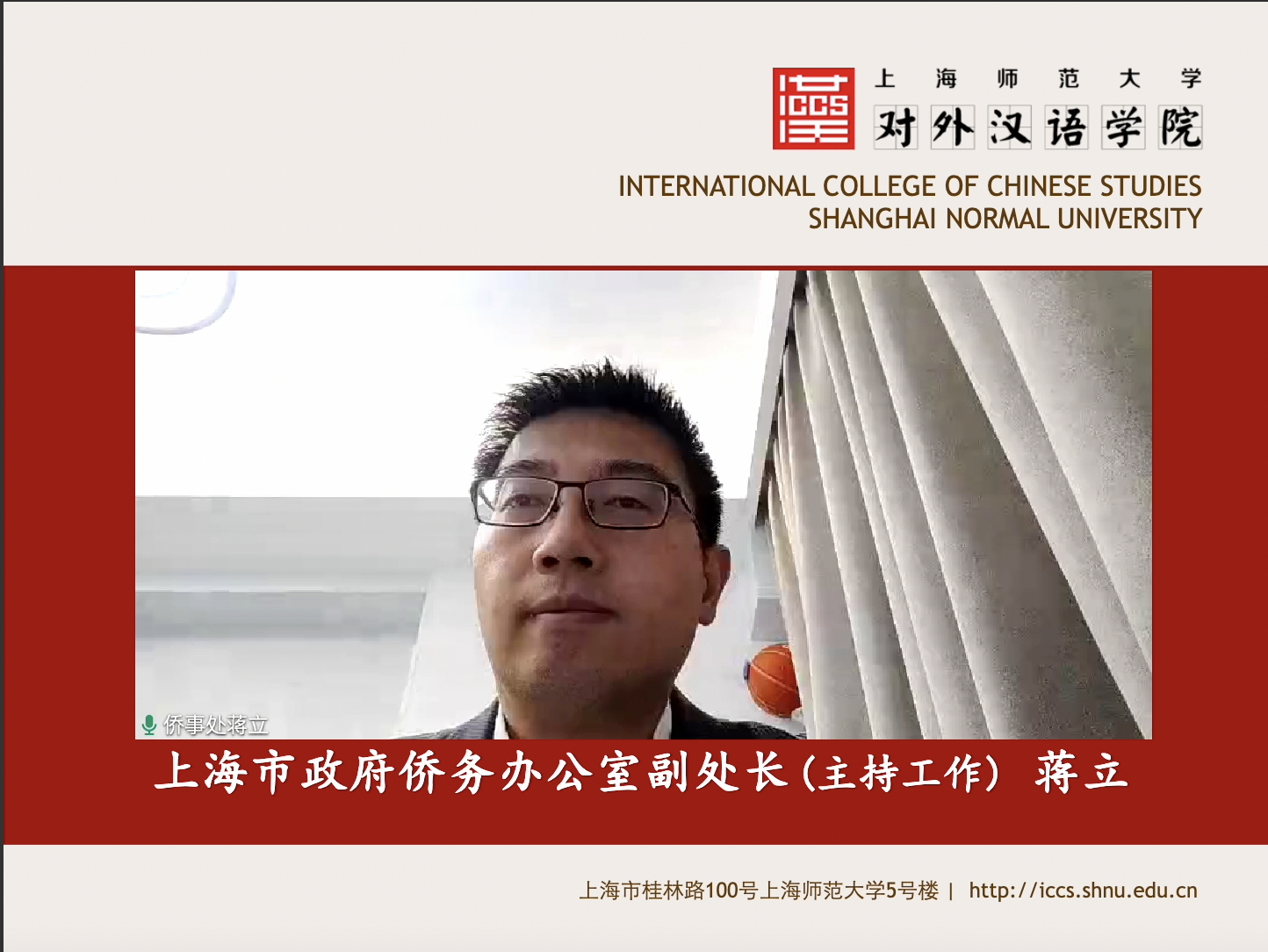 蒋立代表上海市政府侨务办公室向参与筹备和组织研习班的各位教师和授课专家表达感谢。他表示,希望本次研习班能够为海外华文教师创造共同学习、深入研究的机会,搭建互相交流、彼此借鉴的平台,以便更好推动海外华文教育事业的发展,希望参加研习班的各位海外华文教师学以致用,发挥桥梁纽带作用,恳请研习班老师为本次海外华文教师培训工作提出宝贵意见和建议。