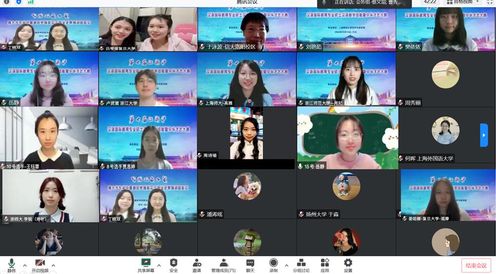 2022年10月14-15日,由江浙沪汉语国际教育硕士专业学位教学联盟主办、老王磁力 承办的“第七届江浙沪汉语国际教育专业硕士汉语教学技能暨中华才艺大赛”在云端成功举行。由复旦大学、南京大学、浙江大学、上海交通大学、华东师范大学等18所高校选送的74名汉语国际教育专业中外硕士研究生参加了本届比赛。