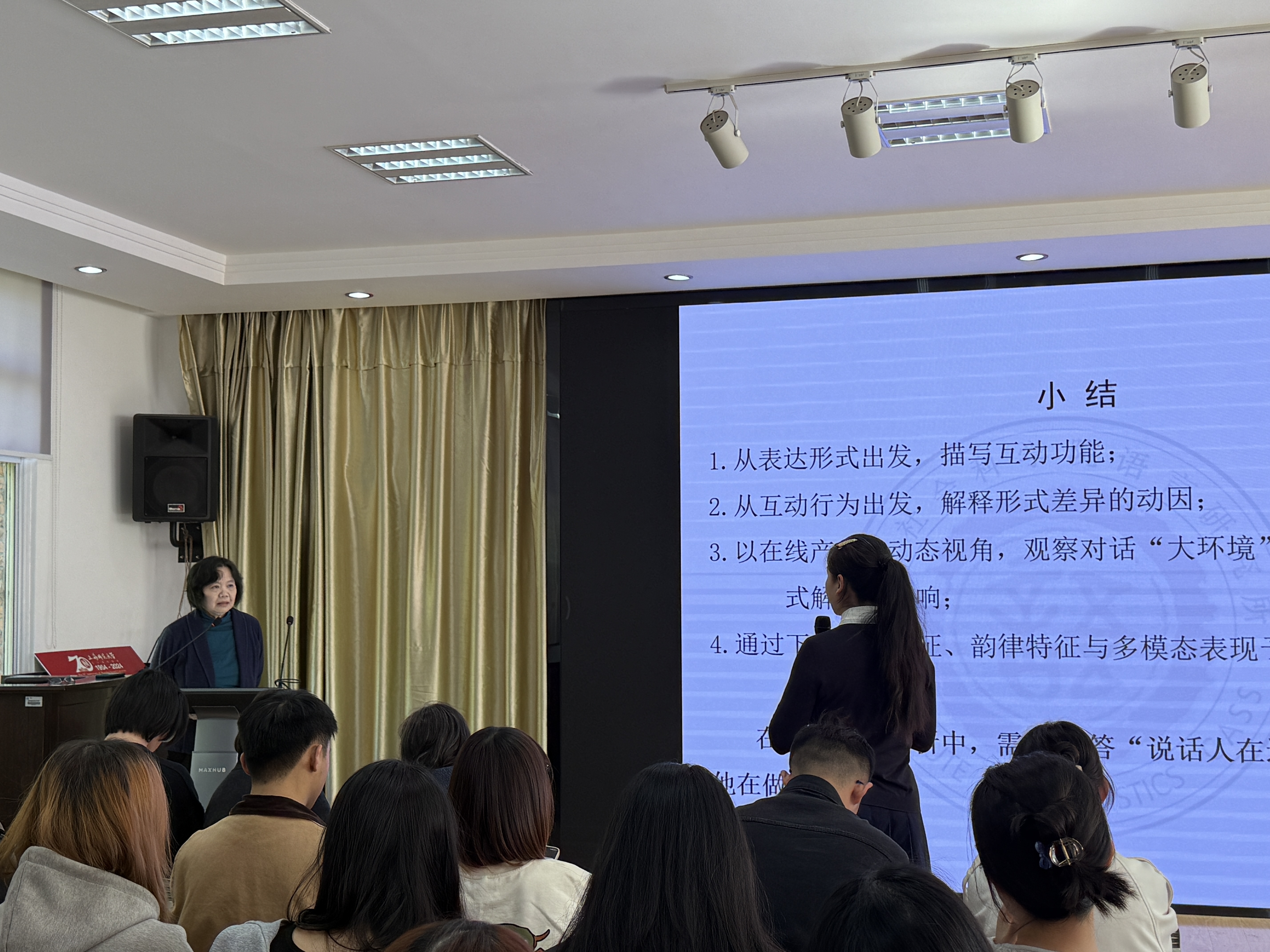 在交流互动环节,师生就否定词叠用使用频率、副词独用、中英文否定副词与礼貌原则等问题展开深入探讨。