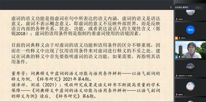 董秀芳教授的讲座内容详实,例证丰富,对语言事实的观察深入细致,观点发人深思。通过此次讲座,大家对虚词的语义功能和语用条件有了更深入的了解,对词典释义工作有了更深刻的认识。