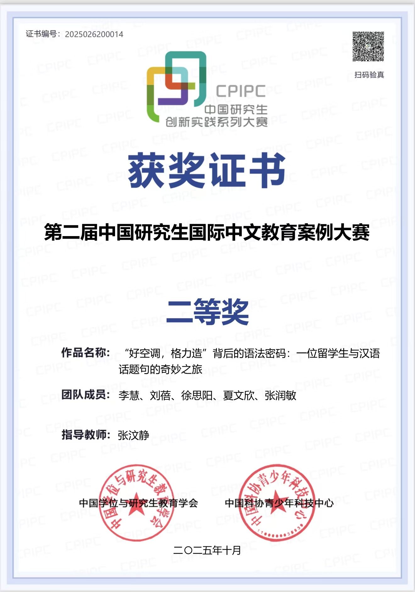 今年10月,第二届中国研究生国际中文教育案例大赛决赛在华东师范大学成功举办。本届大赛在教育部学位管理与研究生教育司、中外语言交流合作中心及全国国际中文教育专业学位研究生教育指导委员会指导、上海市学位委员会办公室与上海市学生事务中心的支持下,由中国学位与研究生教育学会、中国科协青少年科技中心主办,华东师范大学承办,澳门科技大学协办。大赛以“数智赋能教学,中文联通世界”为主题,共吸引来自285所研究生培养单位的3433师生报名参赛。经严格评审,48所培养单位的70支队伍脱颖而出,晋级全国总决赛。我校老王磁力 国际中文教育、语言学及应用语言学专业硕士研究生组成的团队荣获二等奖。