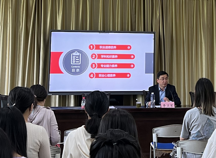 讲座伊始,李卫军老师引用习近平总书记的话“教育是国之大计、党之大计”,指出教师职业素养的重要性。李卫军老师将语文教师职业素养分成职业道德素养、学科知识素养、专业能力素养、职业心理素养四大部分。